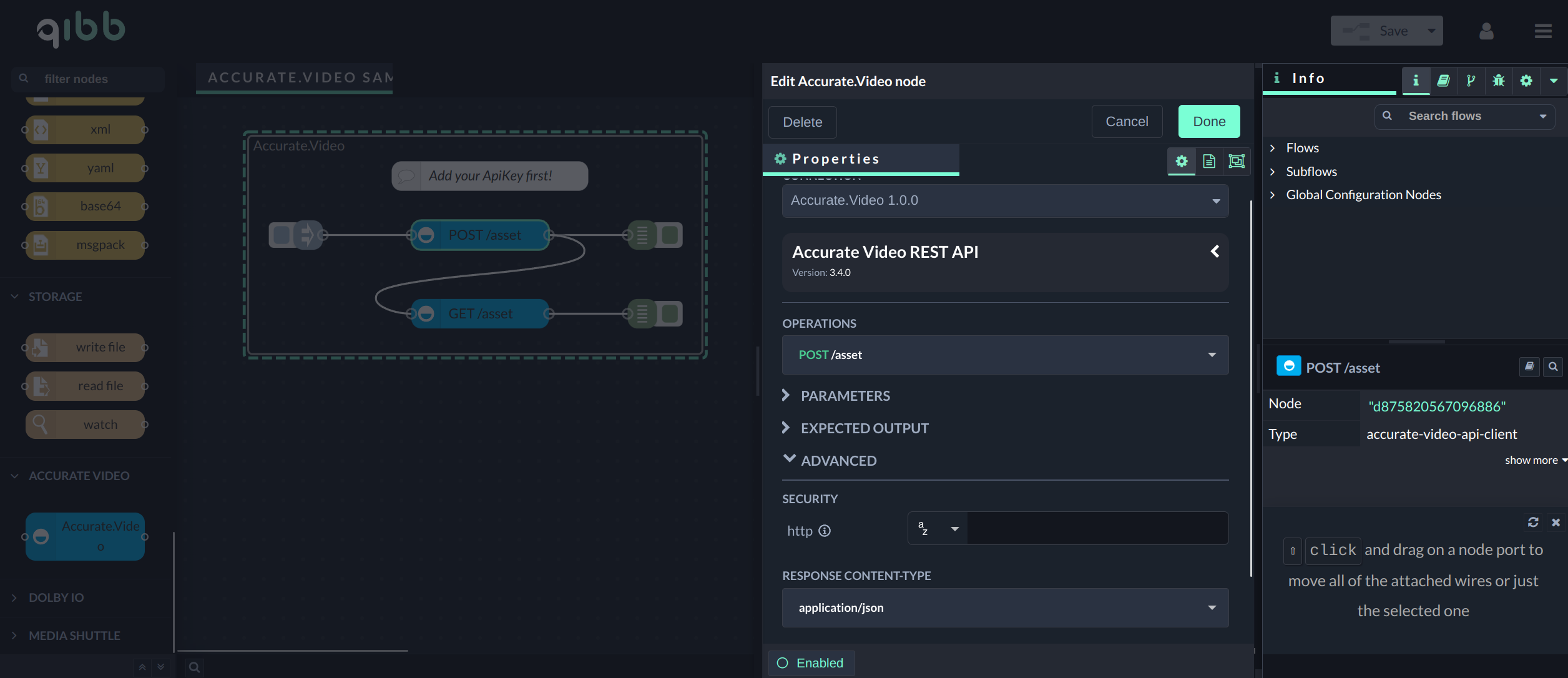 Open the Accurate.Video node, enter your API Key under Advanced/Security, select an operation and you can start using the integration!