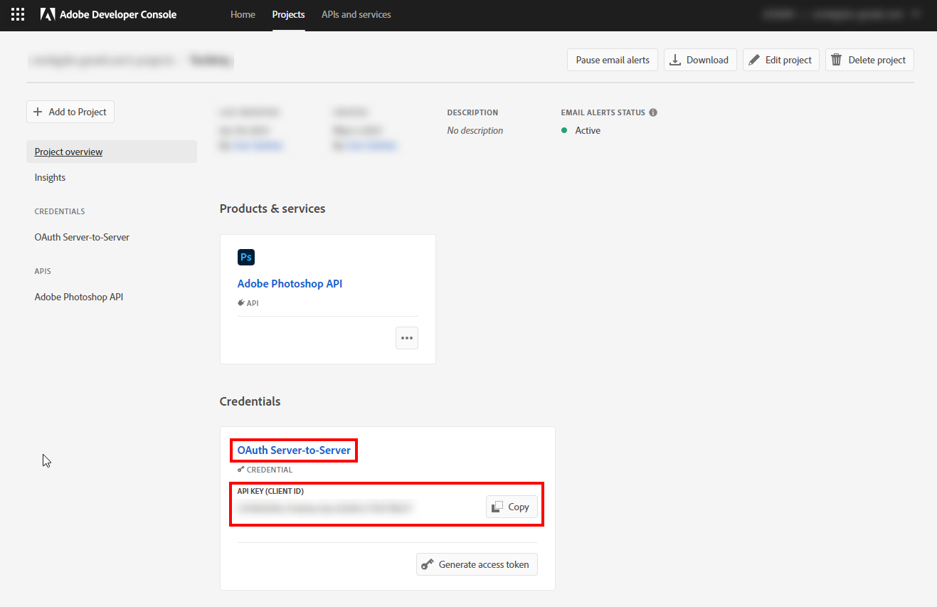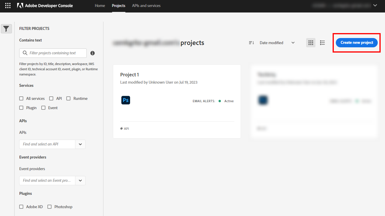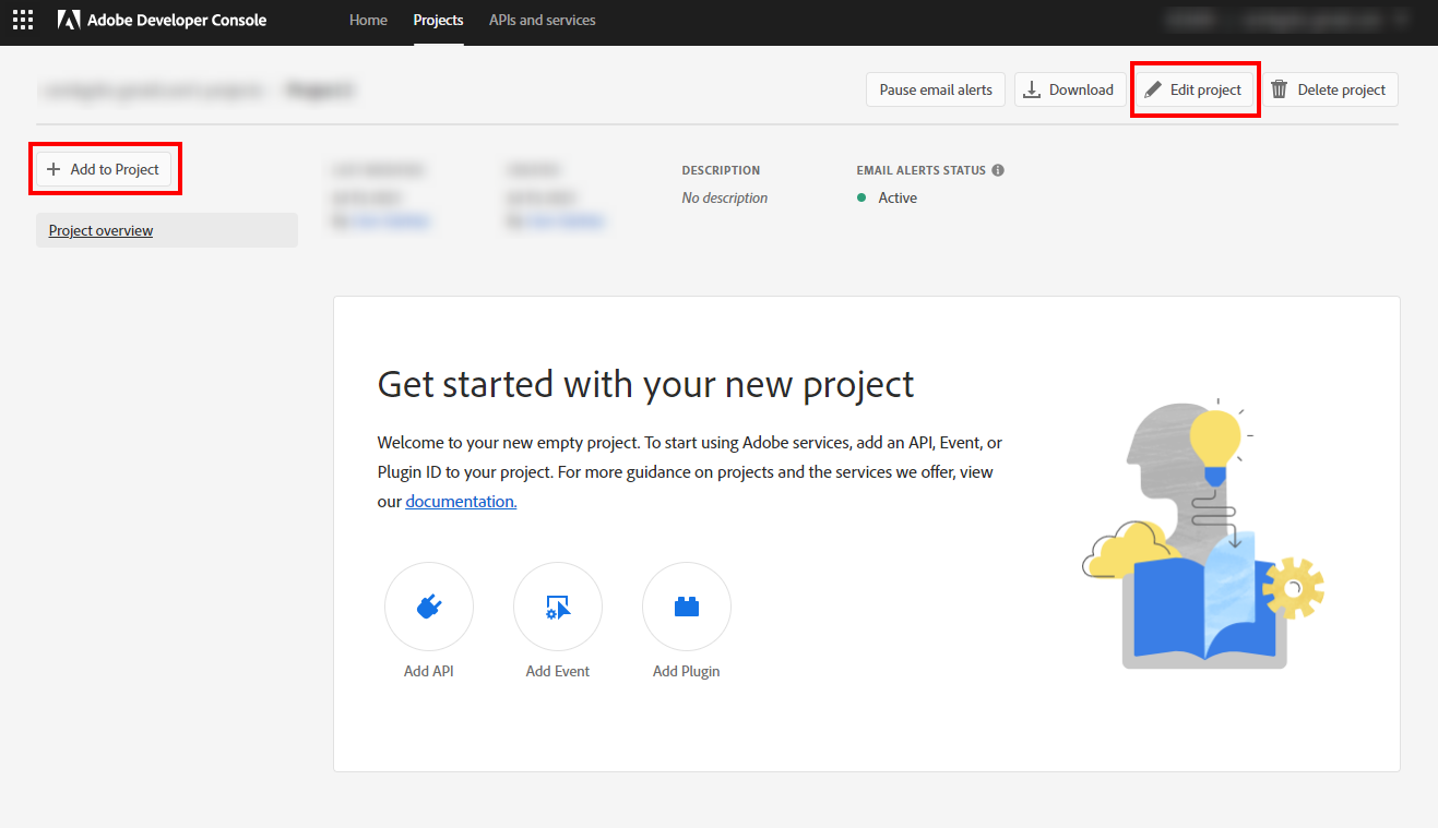 When you click on the button a new project will be created. You have to add Adobe Photoshop API to your project by clicking on the Add to Project button. You can also edit the name of the project by clicking the Edit project button on the right side.