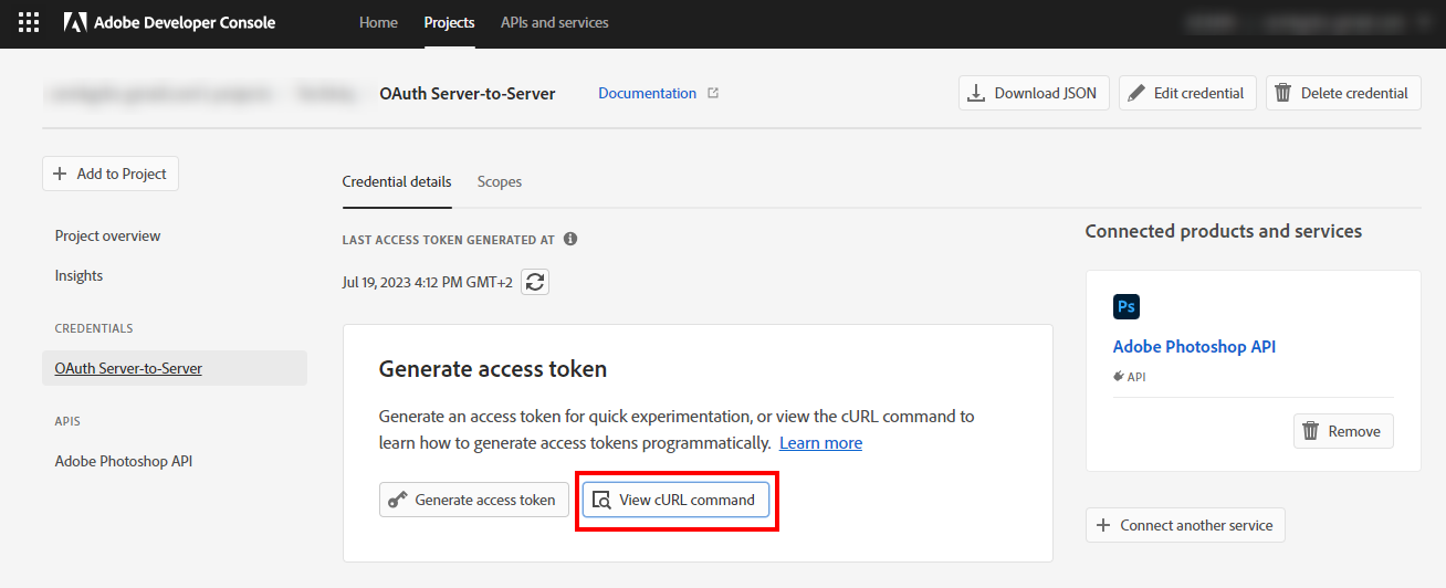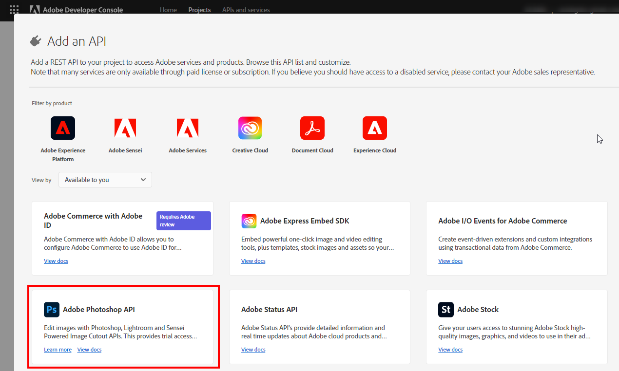 Click on the Add to Project button and select Adobe Photoshop API.
