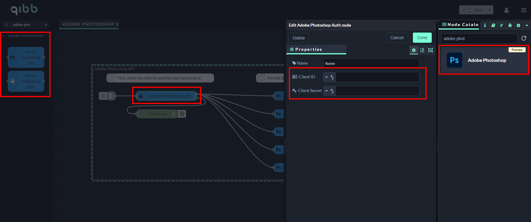 Open the Adobe Photoshop Auth node, enter your Client ID and Client Secret, select an operation in Adobe Photoshop node and you can start using the integration!
