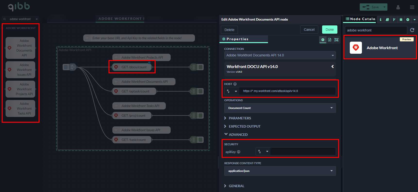 Open the Node Catalog in the right sidebar of the qibb Workflow Editor and install the Adobe Workfront nodes by clicking on the "+" button.