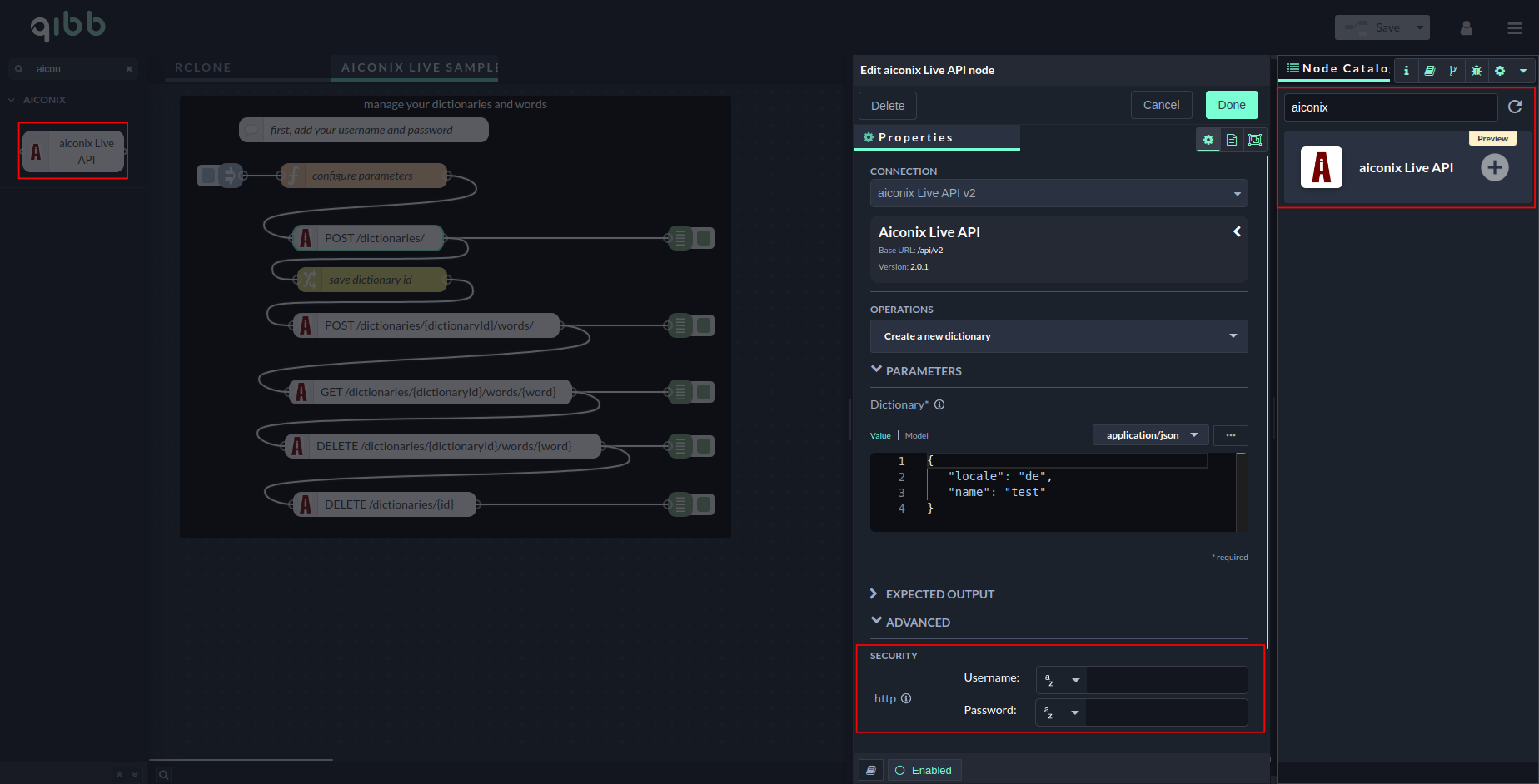 Go to qibb Workflow Editor, open Node Catalog in the right sidebar, and install aiconix Live node by clicking on the + button.
