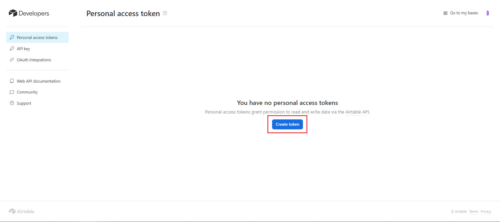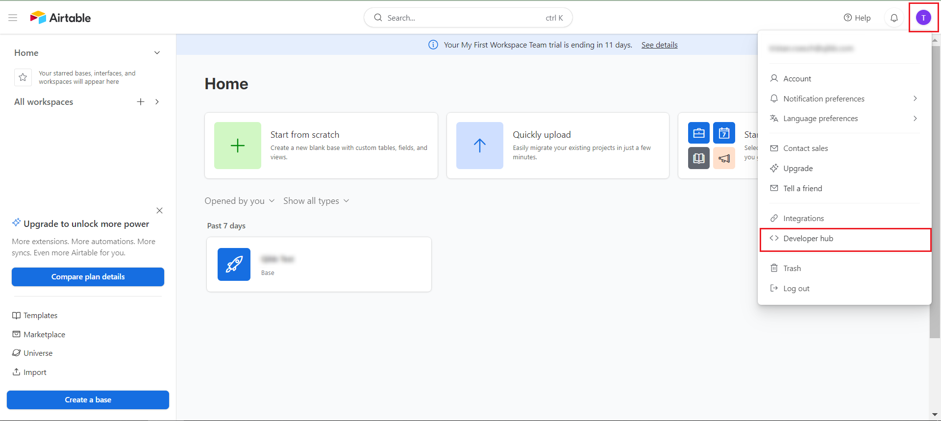 Login to your Airtable dashboard. Click on your account in the upper right corner of the screen. Here you'll see a dropdown menu appear. Click the Developer hub option.
