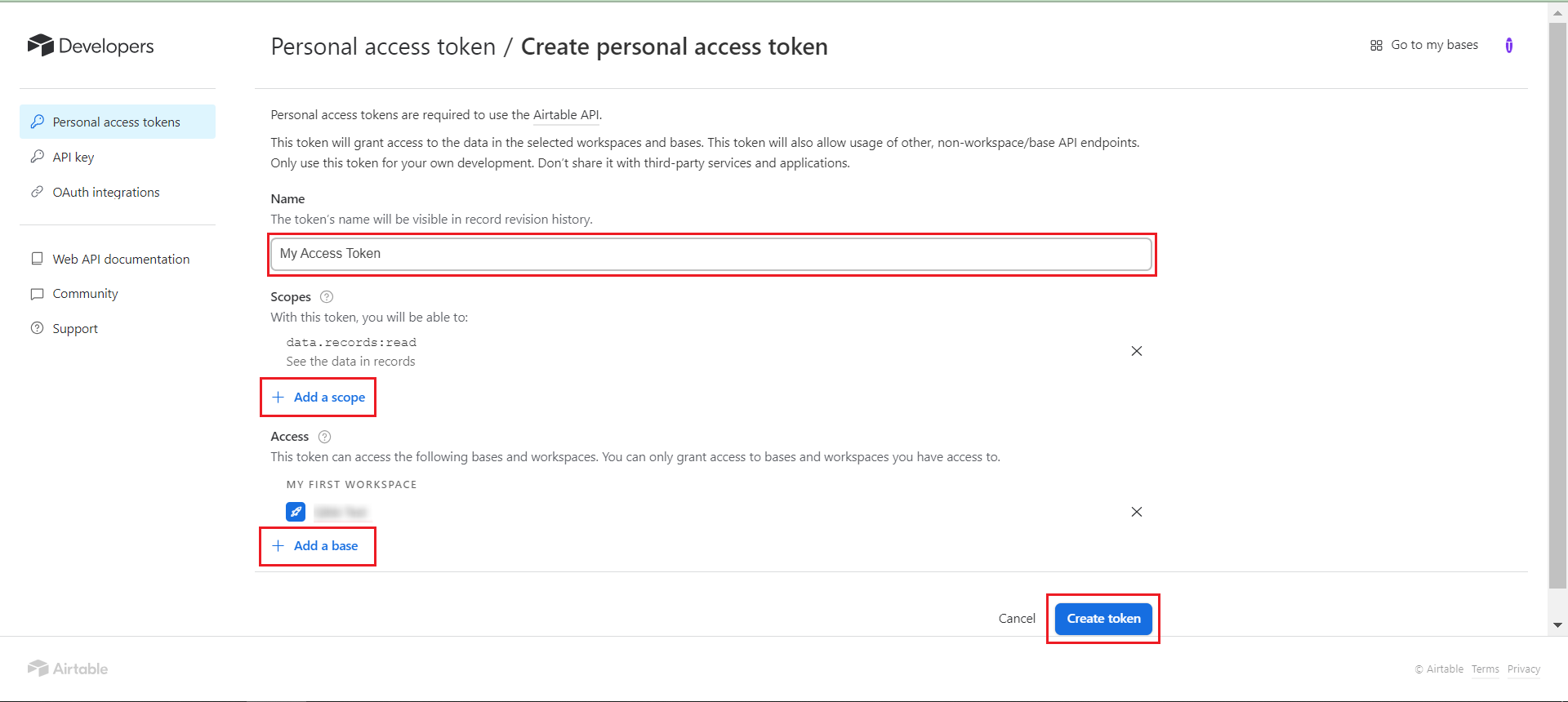 First name the Personal Access Token, then choose the scopes you'd like this PAT to have access to. More information on which scopes are currently offered can be found here. Finally, choose what level of access this PAT will have. Options include choosing a single base, multiple bases, all of the current and future bases in a workspace you own, or all of the bases from any workspace that you own including bases/workspace added in the future.