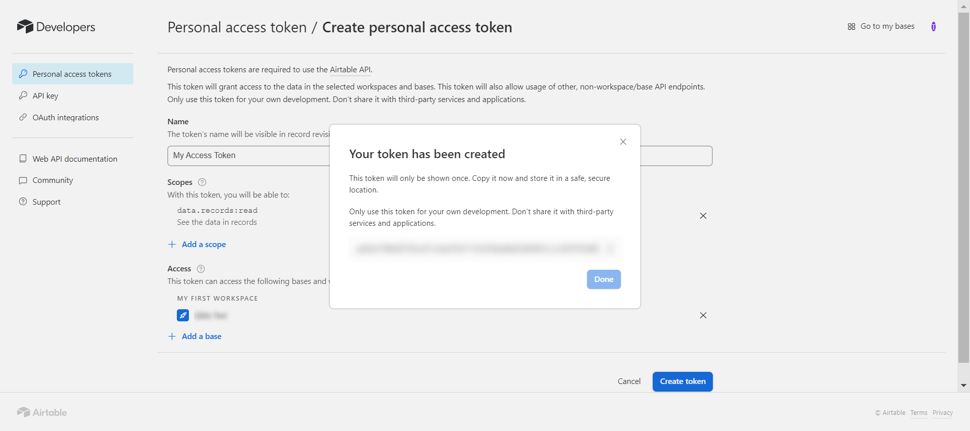 Click once again on Create token. Your token will be displayed and can be copied to your clipboard.