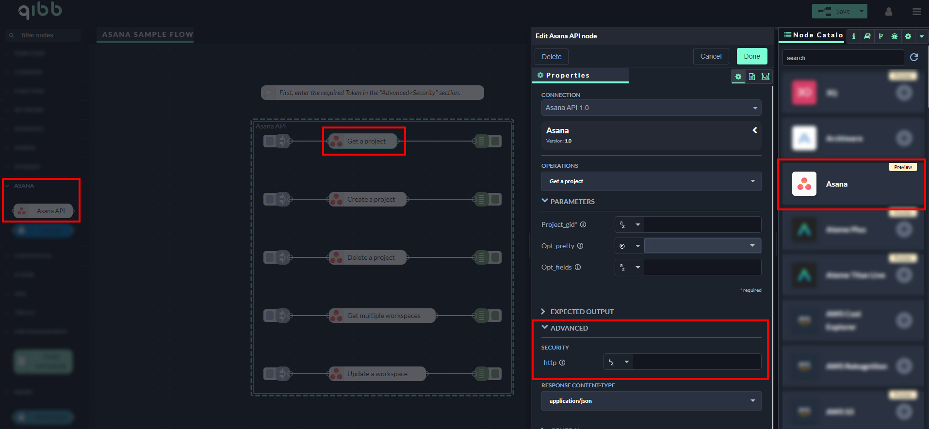 Go to qibb Workflow Editor, open Node Catalog in the right sidebar, and install Asana node by clicking on the + button.