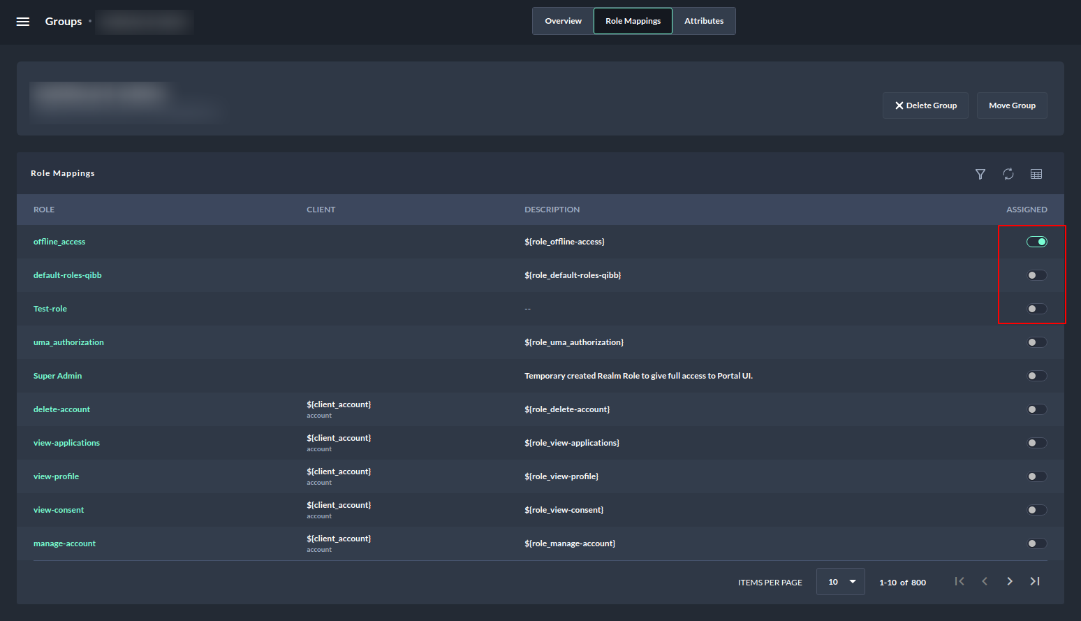 Assigning roles to a group - Remove and add a role by using the assigned toggle button