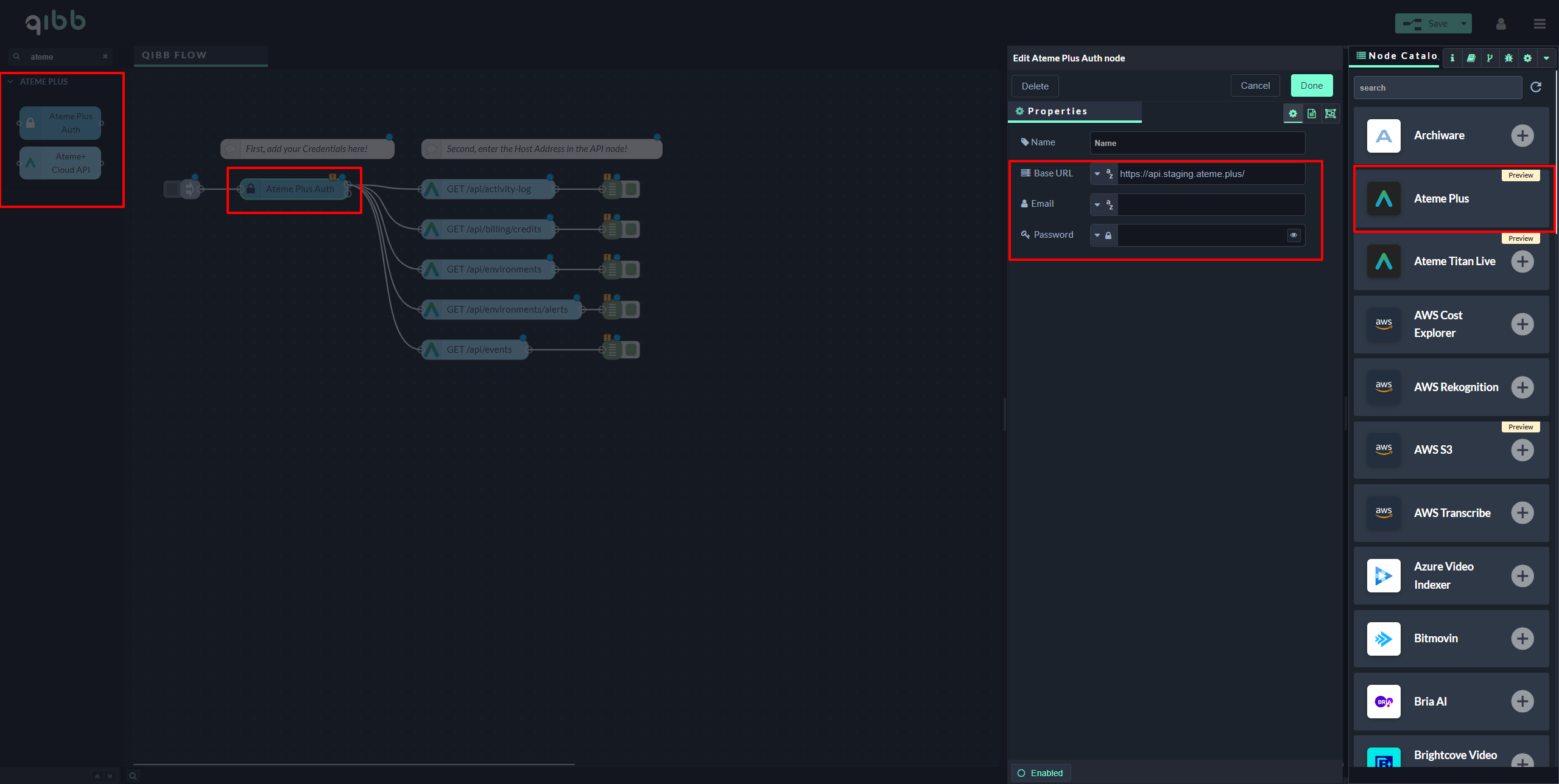 Enter your credentials into the Base URL, Username, and Password fields of the Ateme Plus Auth node and start using the integration!