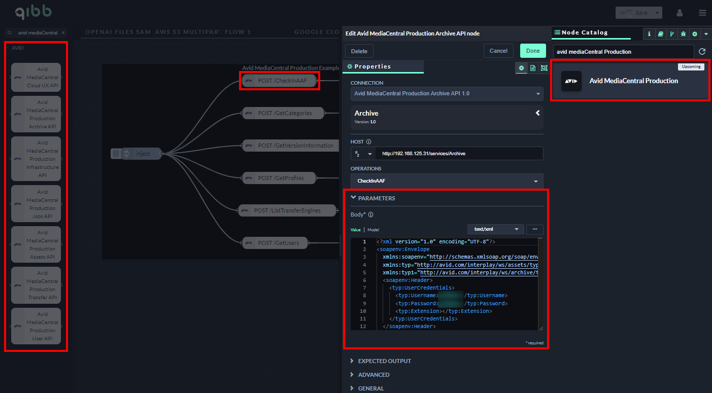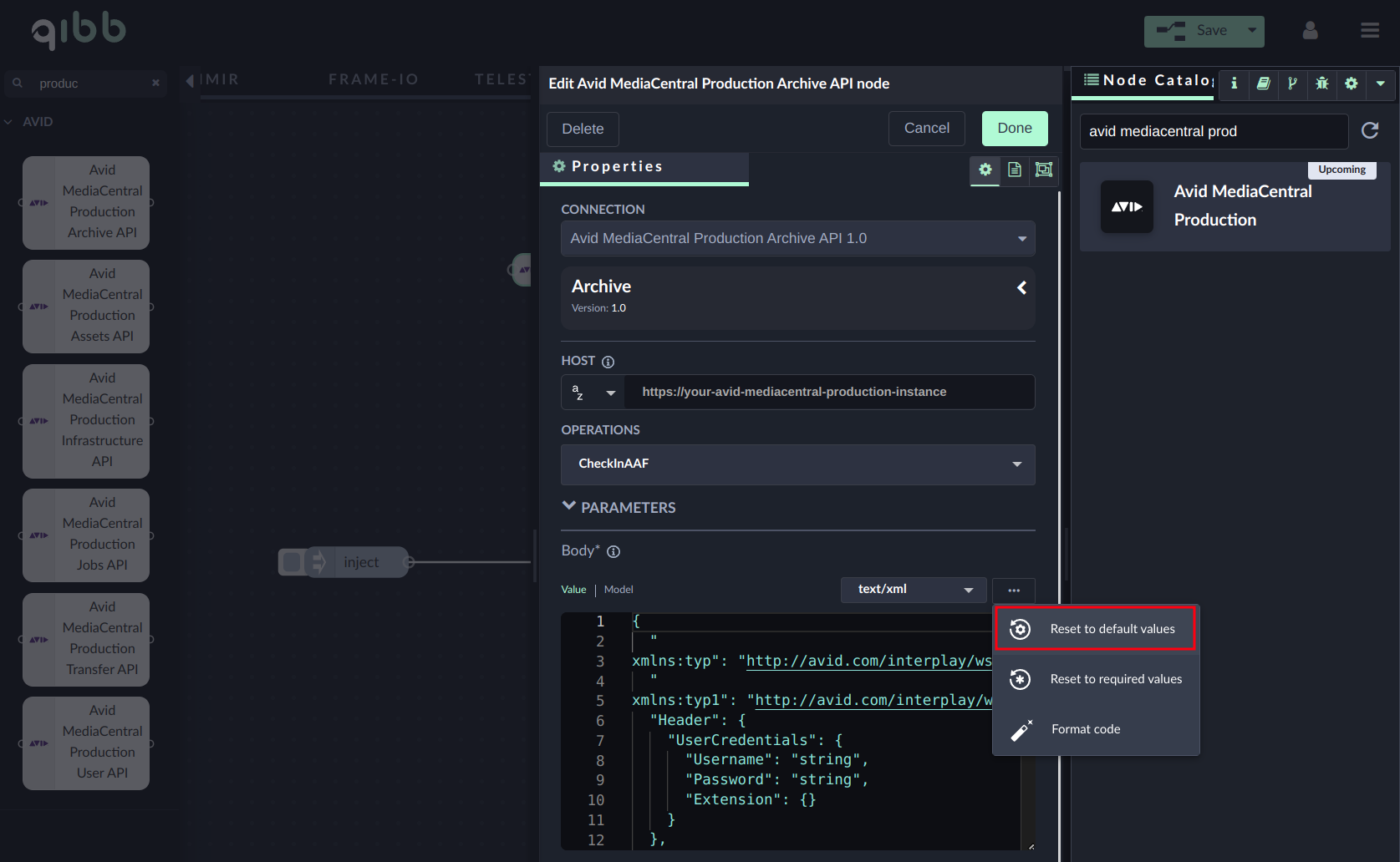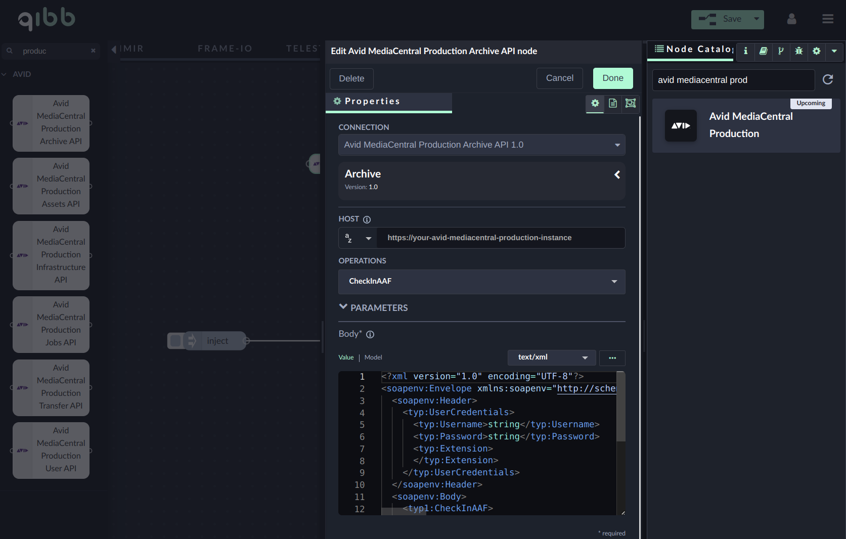 Go to qibb Workflow Editor, open Node Catalog in the right sidebar, and install Avid MediaCentral Production node by clicking on the + button.