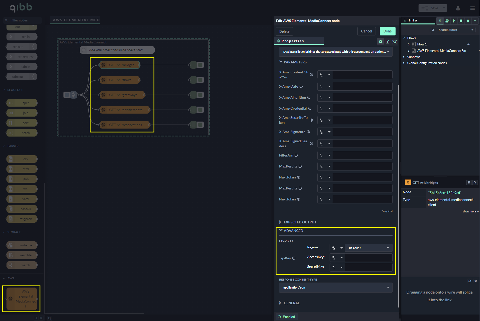 Drag and drop the AWS Elemental MediaConnect node from the left sidebar into your workflow.