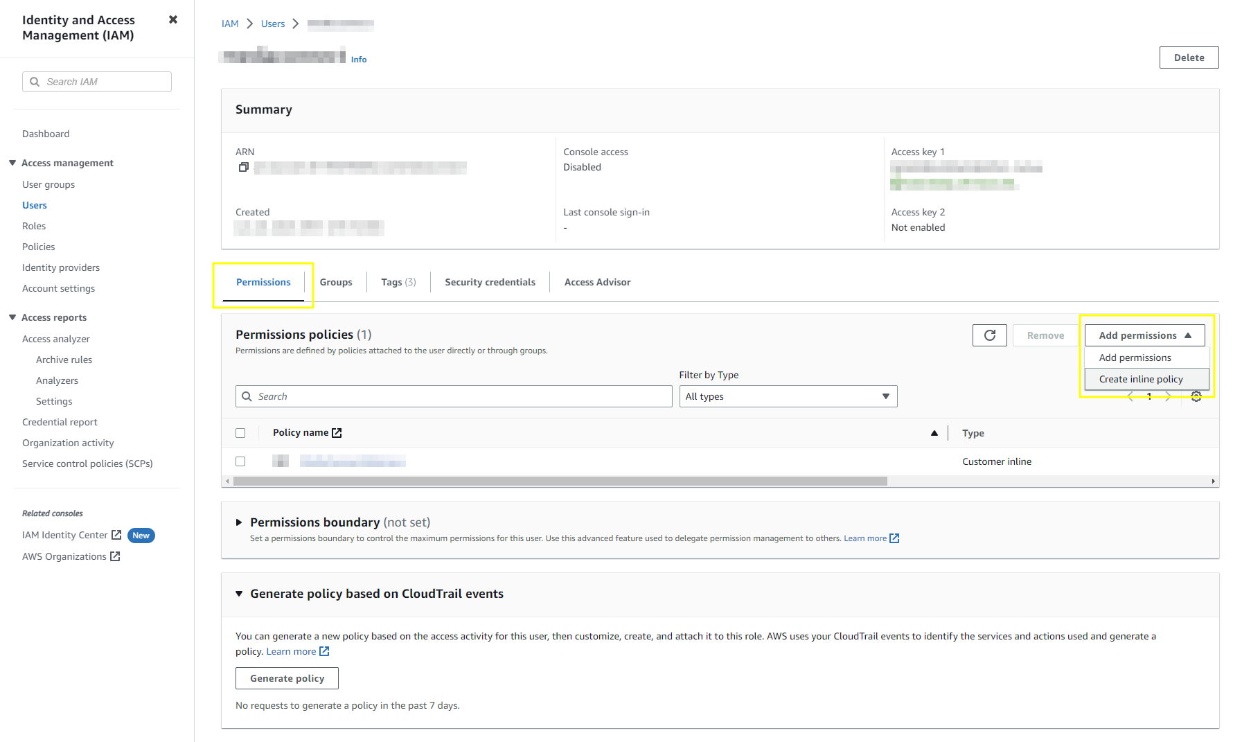 In the navigation pane, choose Users, and select the name of the intended user. As part of the new view, make sure you are on the Permissions tab, click on the Add permissions dropdown, and choose Create inline policy.