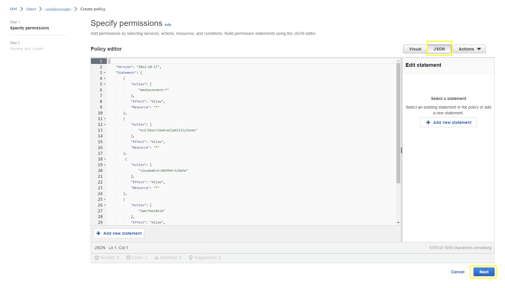 Define your permission by creating a new policy. For that choose the JSON view and use the following policy, granting full access to the AWS Elemental MediaConnect functionality, as well as limited IAM write access, limited CloudWatch read access, and limited EC2 list access. To add more or fewer rights to the policy you can always edit based on your needs.