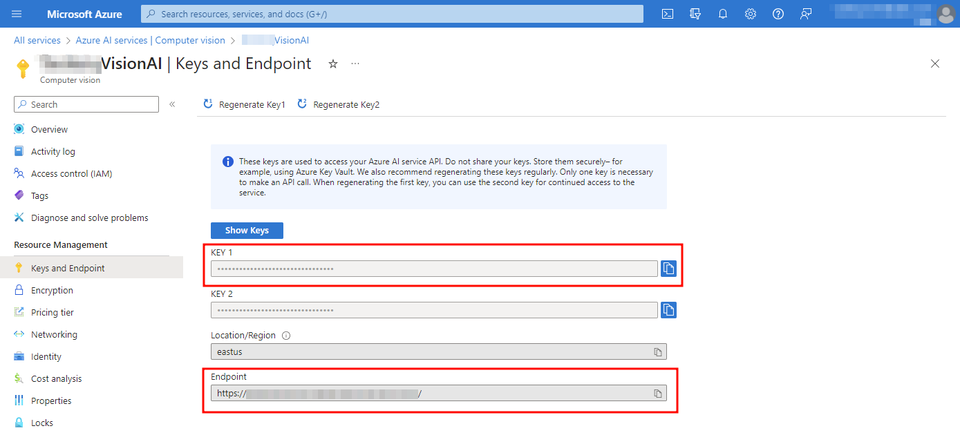 Choose Keys and Endpoint. Your API Key is the value taken from the KEY 1 field. Your Host URL is the host part, taken from the Endpoint field (Example: