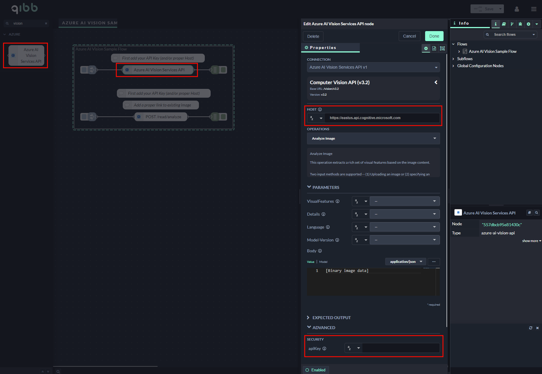 Open the Azure AI Vision Service API node you want to use, select an operation, and add the API Key as part of the apiKey field in the Advanced section. If you are using a Host URL different than the default one (