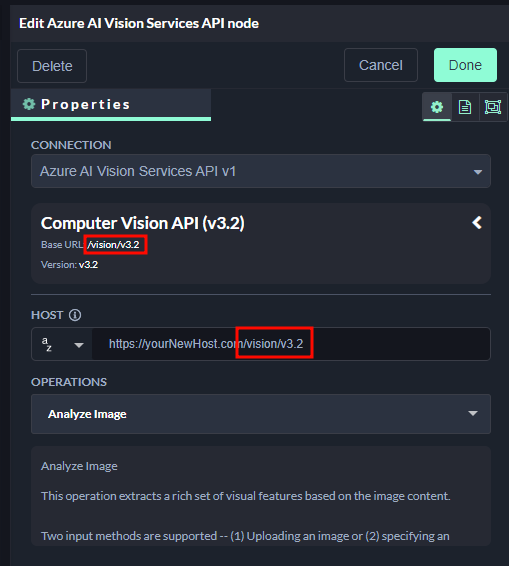 https://eastus.api.cognitive.microsoft.com). By default, the Azure AI Vision node useseastus.api.cognitive.microsoft.comhost.