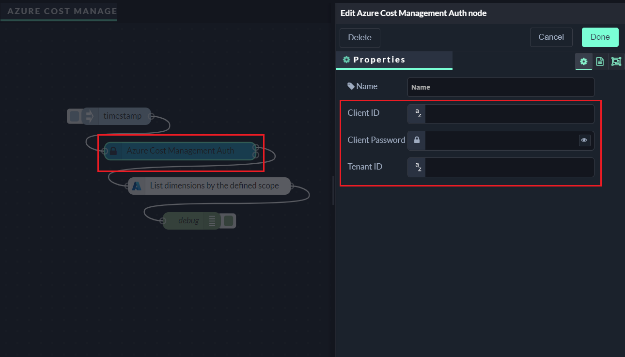 Enter your credentials in the Client ID, Client Password, and Tenant ID fields in the Azure Cost Management Auth node.