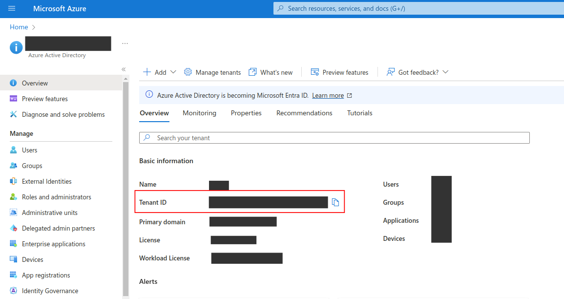 Your Tenant ID is displayed on the starting page of the Azure Active Directory.