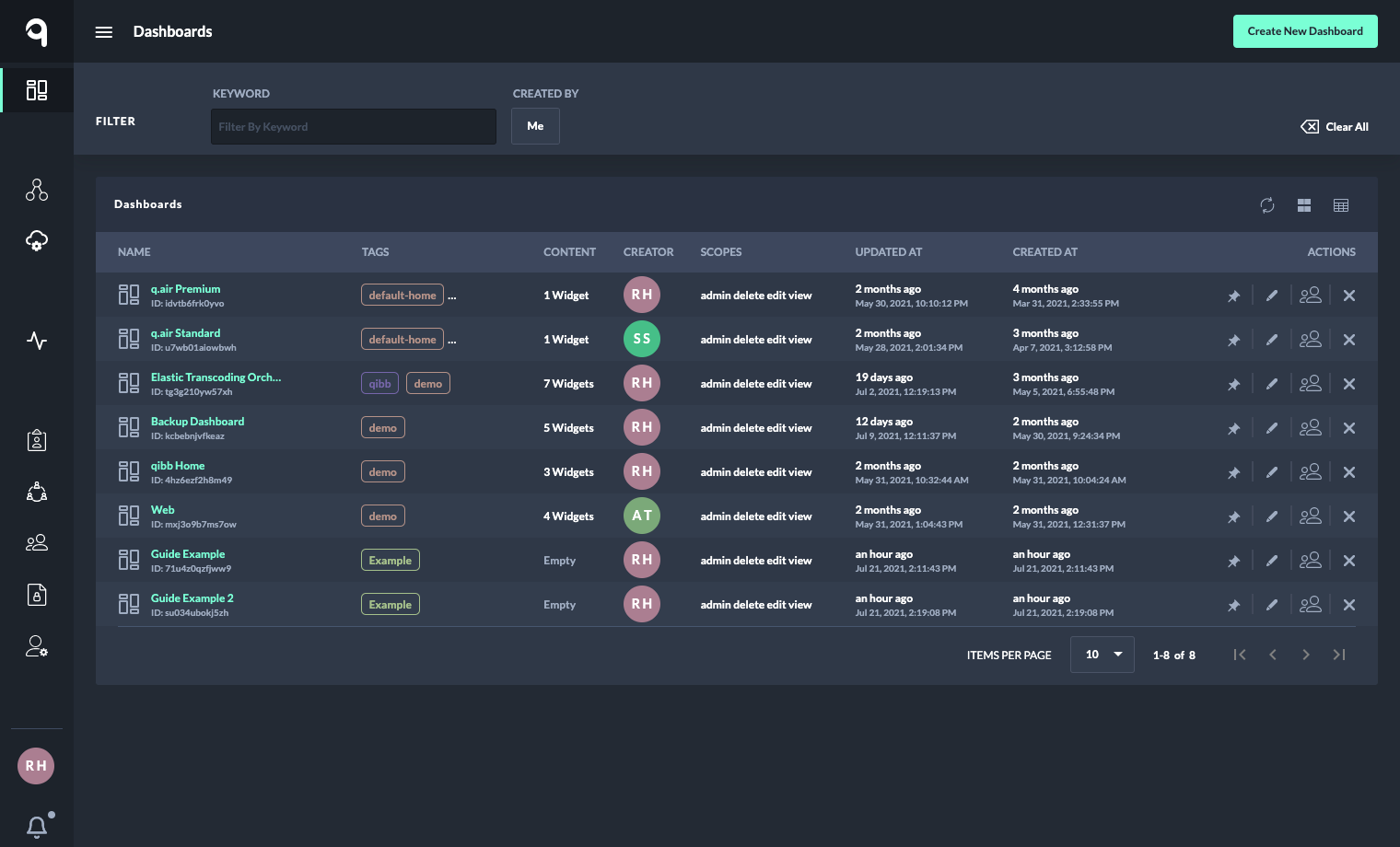 A compact view displays each entry as a tile with the most important metadata. ![]() | A list view that displays each entry in a table with additional actions to manage dashboards. ![]() |