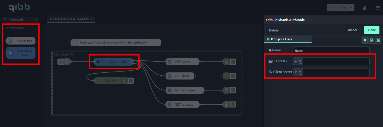 Open the CloudSoda Auth node, enter your Client ID and Client Secret, select an operation in CloudSoda node and you can start using the integration!