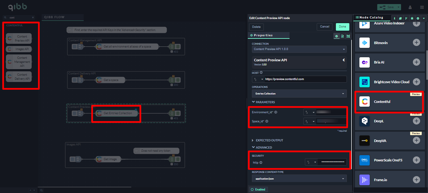 Enter your API Keys in the Advanced/Security field of the node and if required your Environment and/or Space ID and start using the integration!