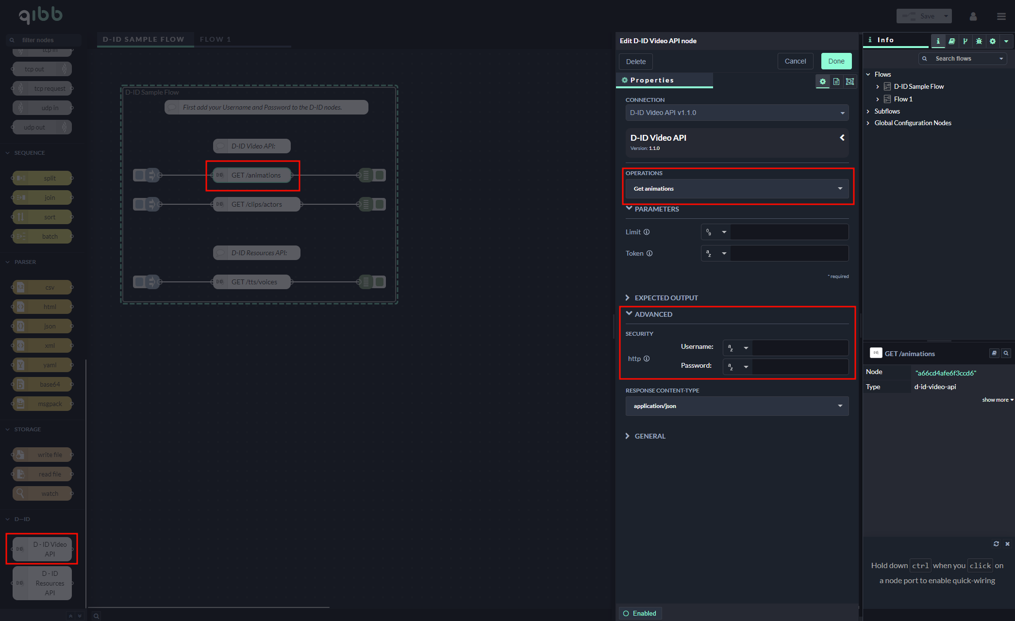 Open the D-ID API node you need to use, select an operation, and write your Username and Password in the respective fields, part of the Advanced security section.