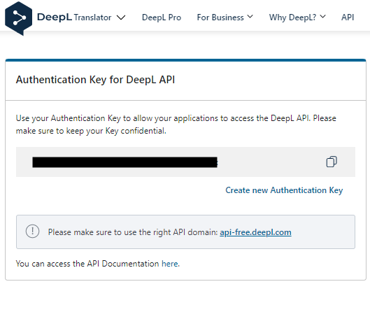 Enter your DeepL Authentication key (including the