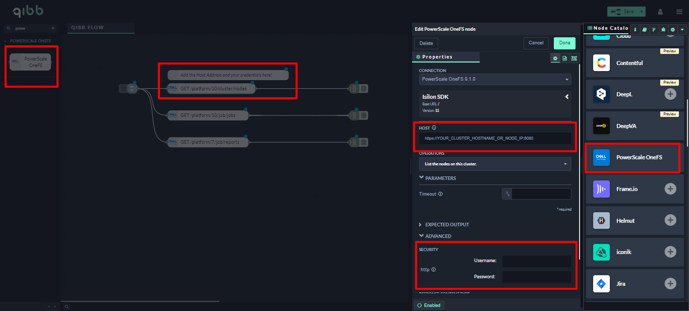 Go to qibb Workflow Editor, open Node Catalog in the right sidebar, and install Dell PowerScale OneFS node by clicking on the + button.
