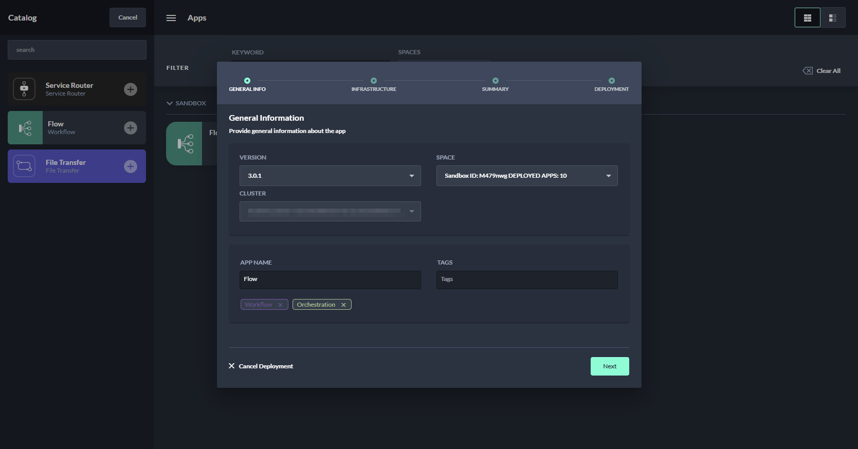 On the General Info page, the first page of the deployment process, you can find a variety of options and text boxes to make basic settings for the deployment of an app, including: