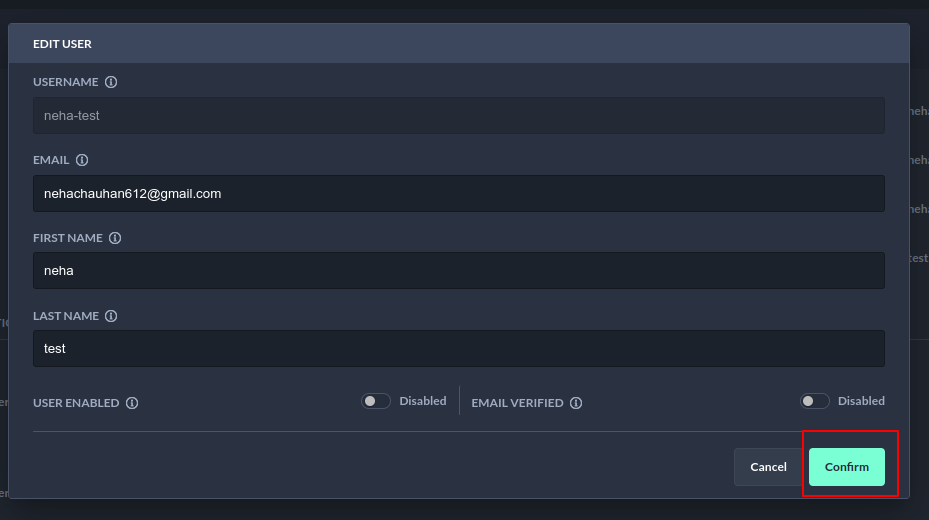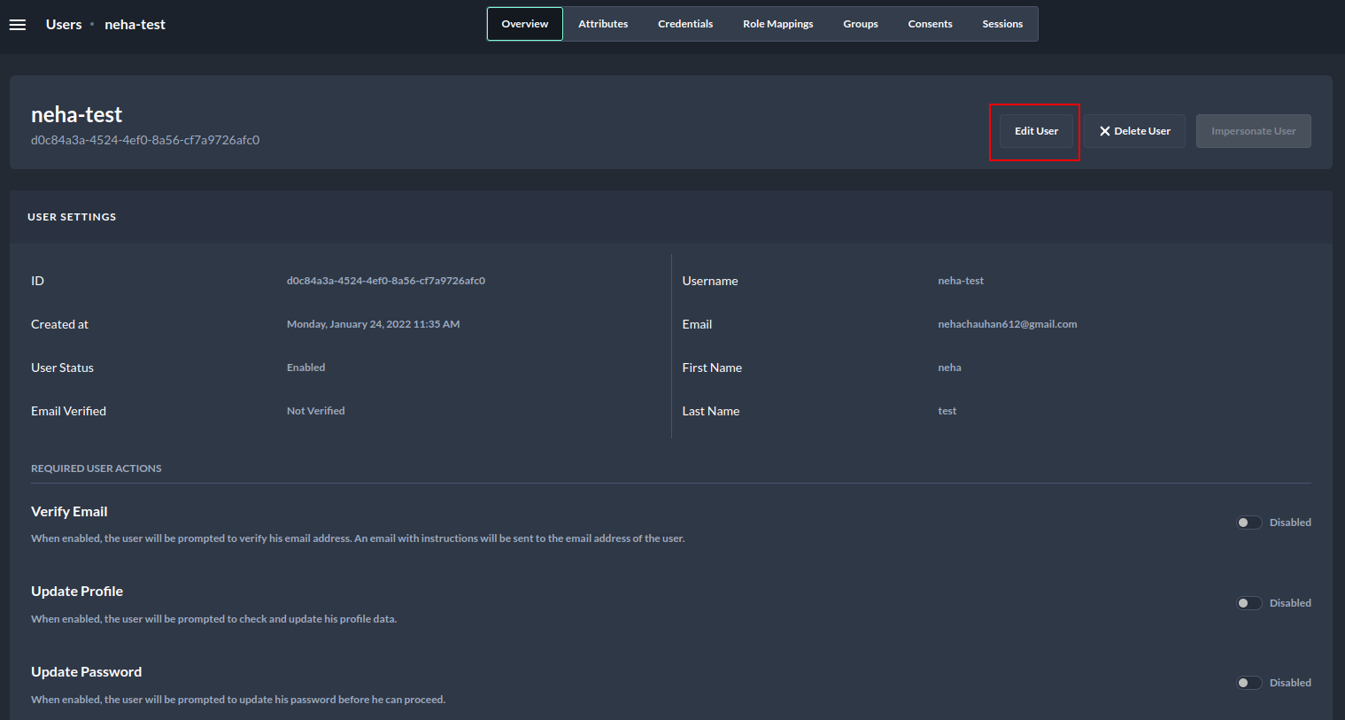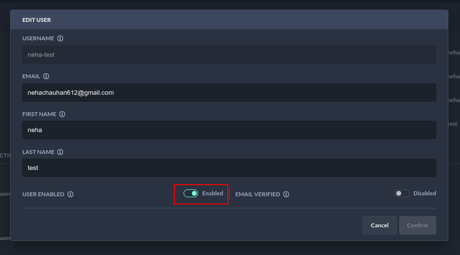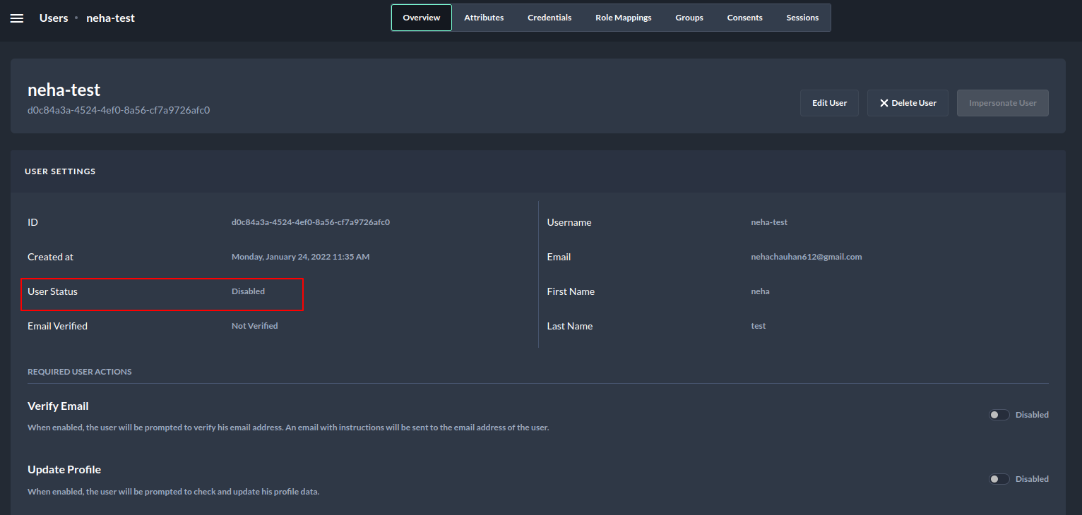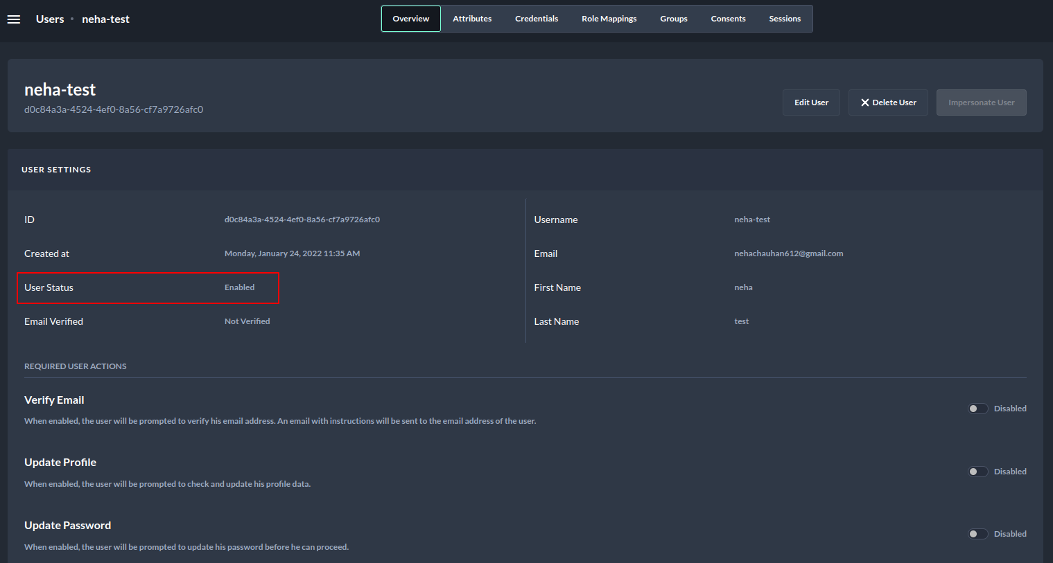 Finally, the view is refreshed and the user status setting is set to disabled as shown below: