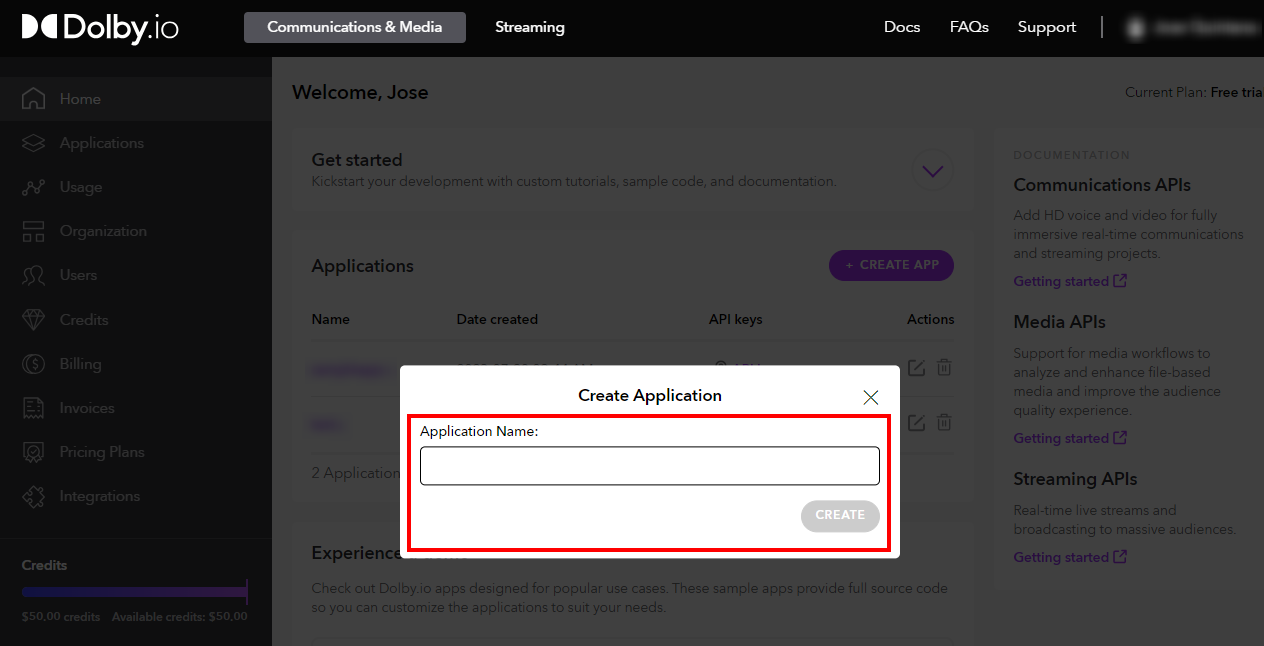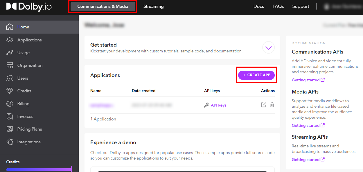 Get an App Key and App Secret associated with your Dolby.io application in the Dolby.io Dashboard. Click Create App to get started.