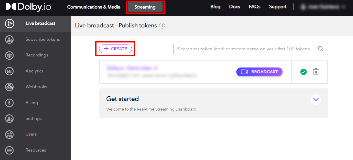 To get your Publishing token for Dolby.io Streaming Director API, switch to the Streaming page from the top navigation bar and click on the Create button.