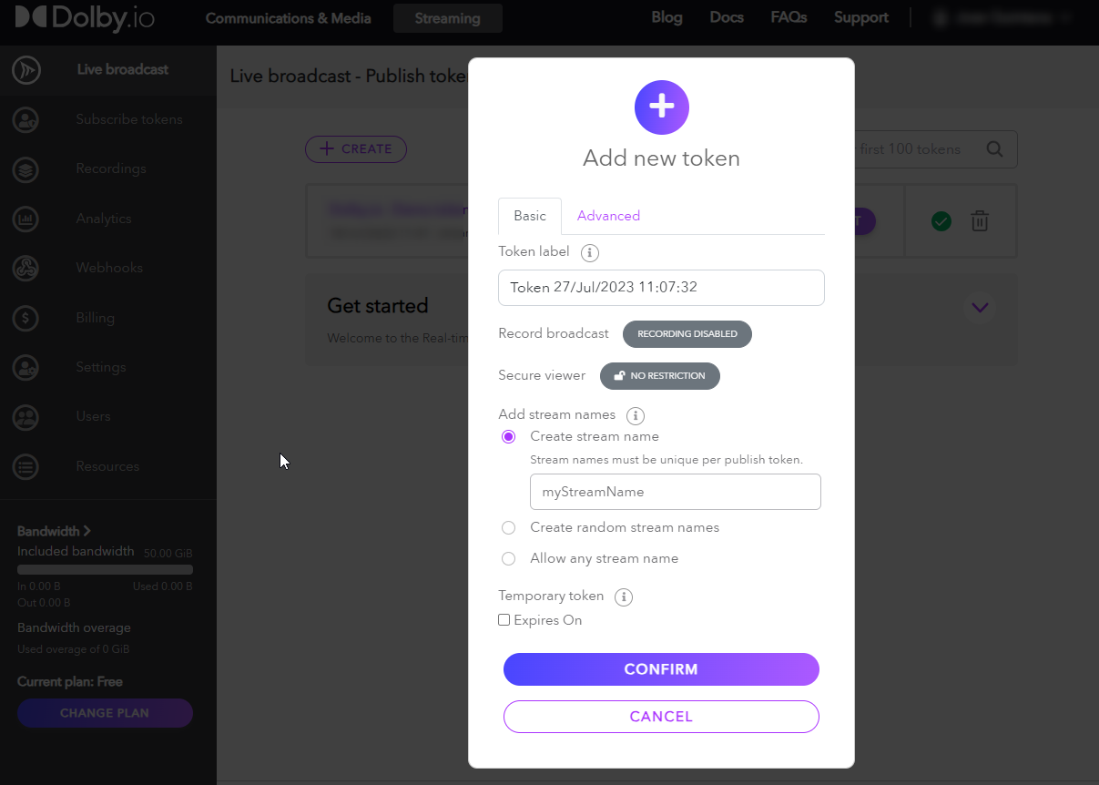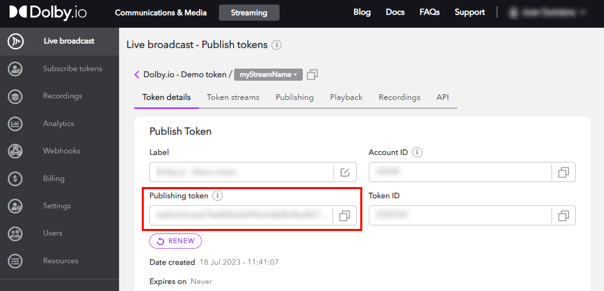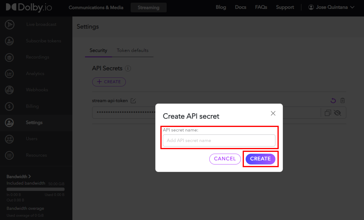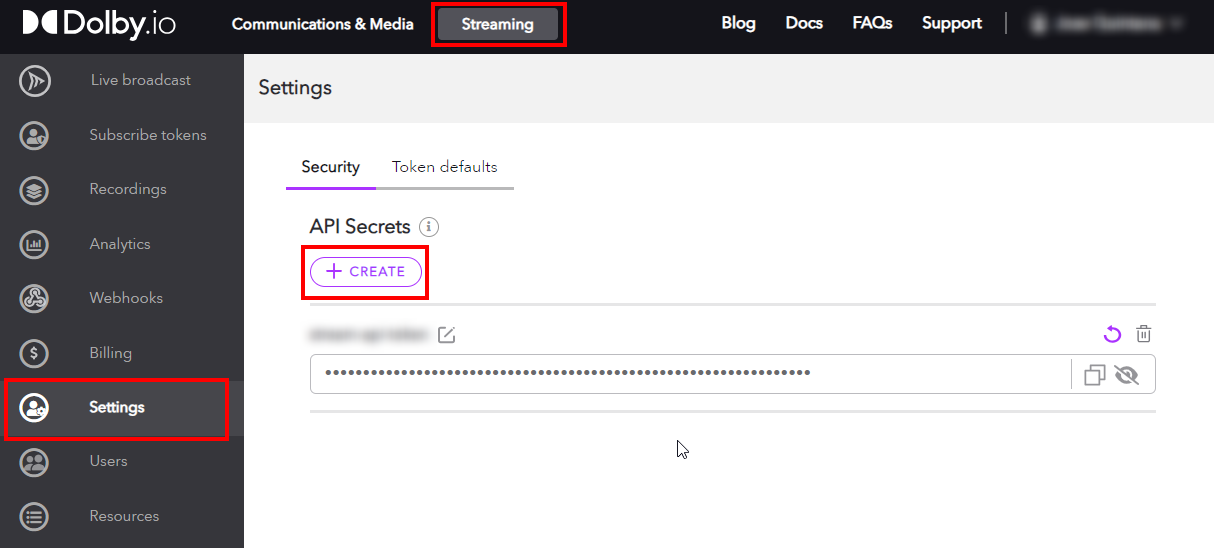 To get your Publishing token for Dolby.io Streaming Multicast API, go to the Settings from the menu on the left side of the page and click on the Create button.