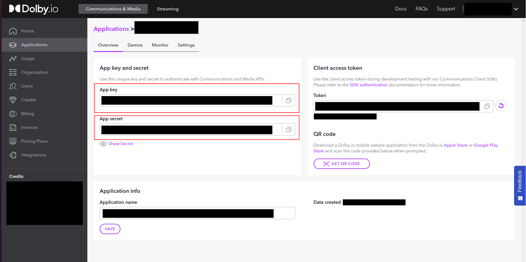 Once you create a new application you will see your App Key and App Secret on the dashboard in the Applications view. You will use the App Key and App Secret to authenticate for Dolby.io Communications API and Dolby.io Media API.