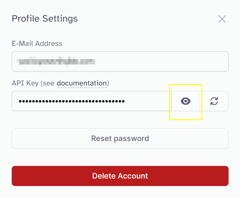 Next, click on the eye icon on your profile to access your xi-api-key. Save your xi-api-key to be able to use it later.