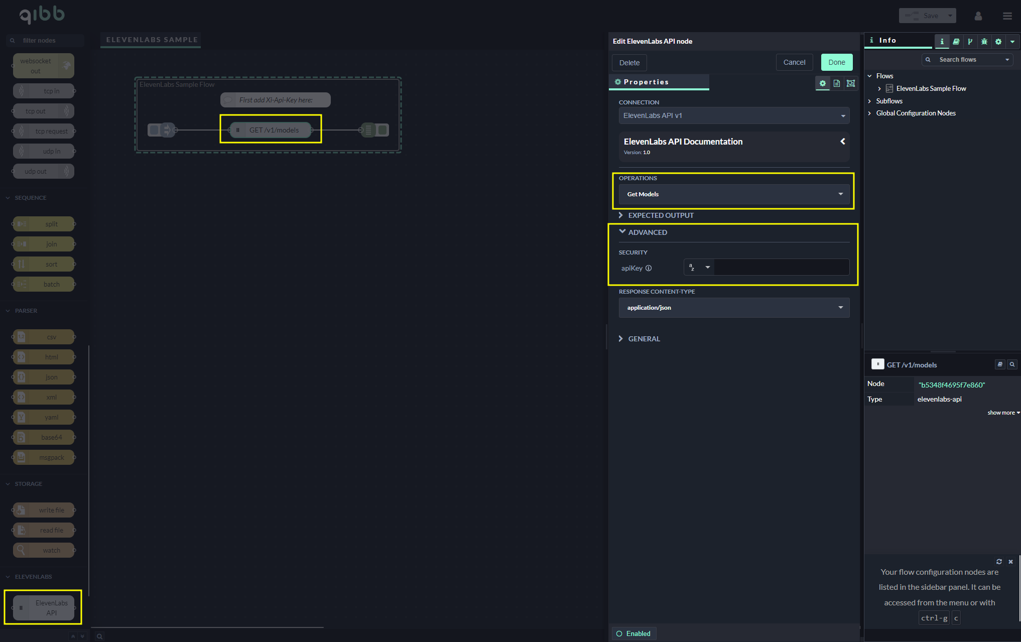Open the ElevenLabs API node you need to use, select an operation, and write your xi-api-key in the apiKey field, part of the Advanced section. You can start using the integration!