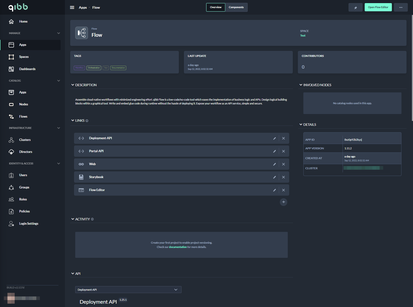 In addition to the general overview of the Flow application, it is possible to see more detailed information about the application. All information about the Kubernetes deployment can be found on the "Components" tab of the Flow App.