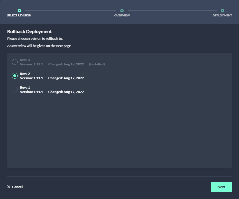Rollback | If changes have been made to the application, such as version upgrades or downgrades since the application was first deployed, the Rollback menu item is enabled to allow you to roll back changes made since the initial deployment. |