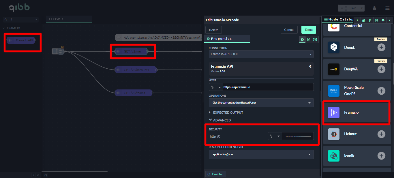 Go to qibb Workflow Editor, open Node Catalog in the right sidebar, and install Frame.io node by clicking on the + button.