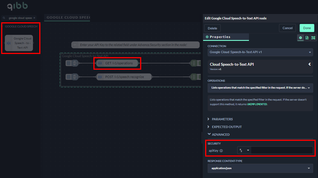 You can find more details and the supported operations on Google Cloud Speech-to-Text | qibb Catalog.