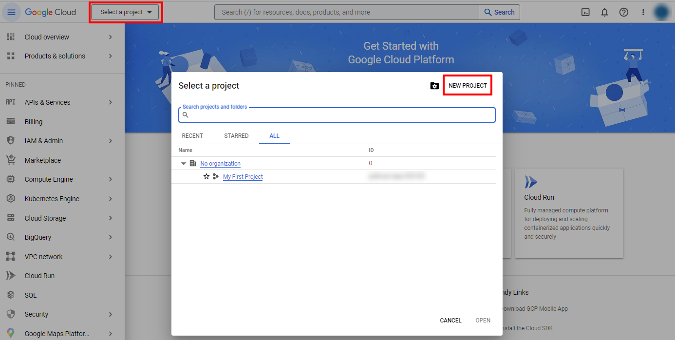 Sign in to your Google Cloud account, click on the Select a project button and click on New Project.
