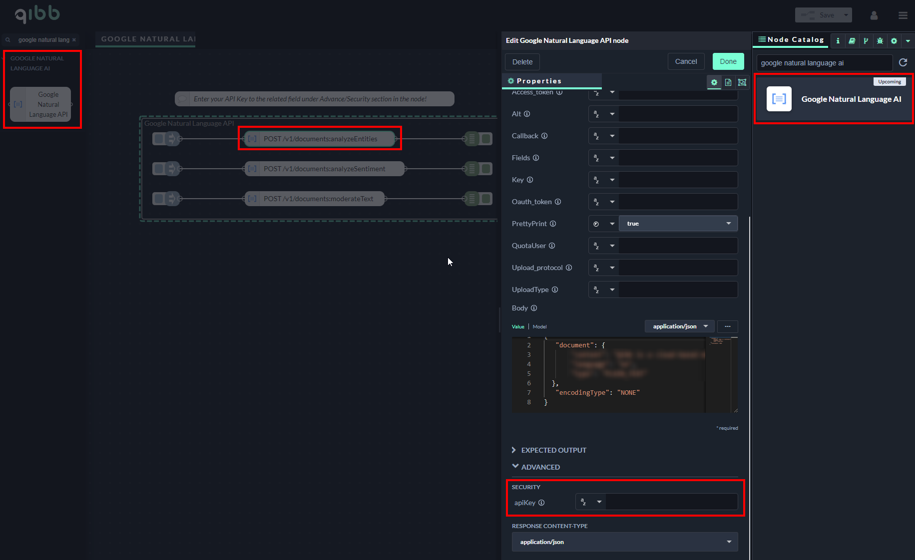 Go to qibb Workflow Editor, open Node Catalog in the right sidebar, and install Google Natural Language API node by clicking on the + button.