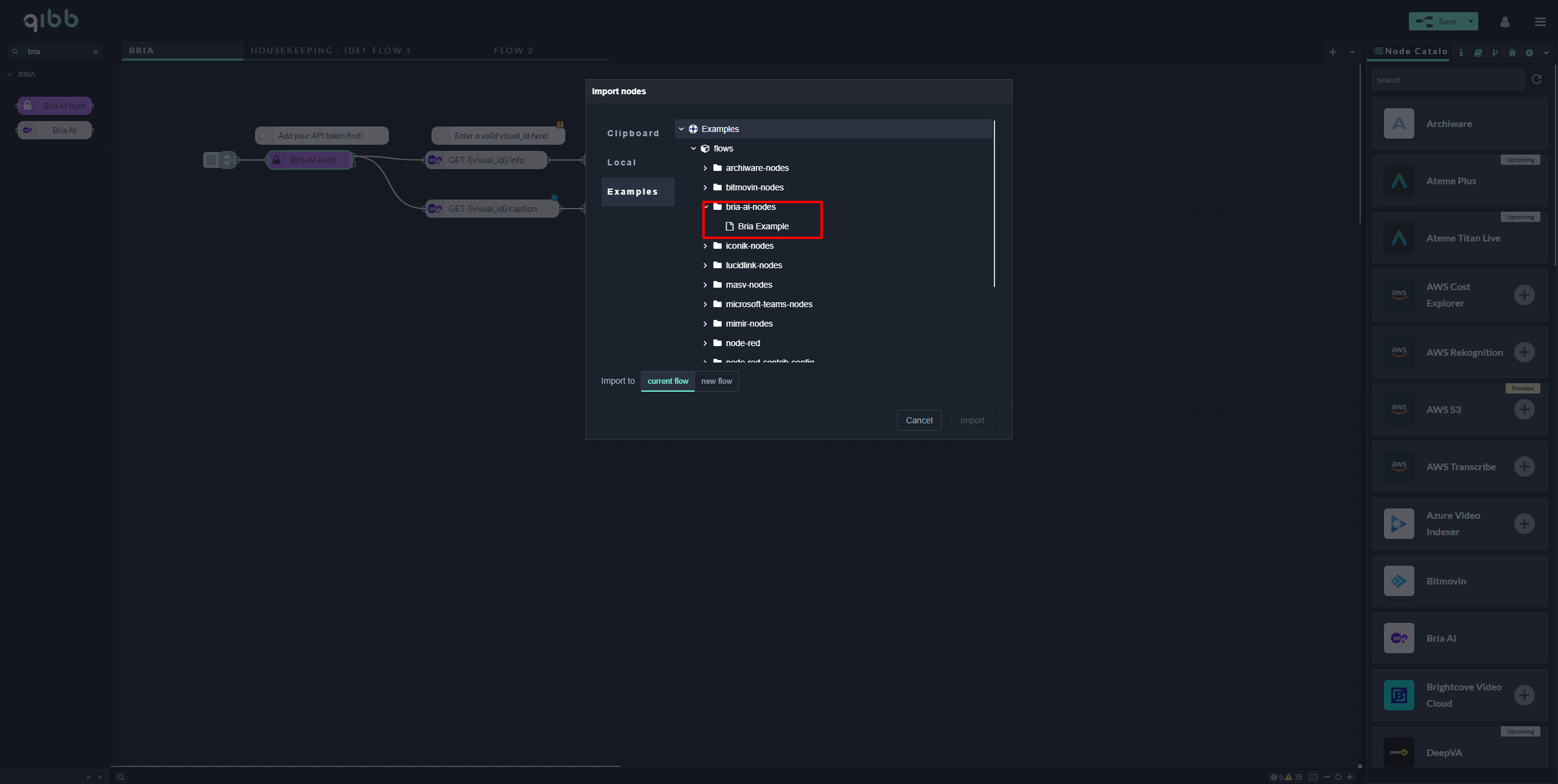 Go to qibb Workflow Editor, open Node Catalog in the right sidebar, and install Bria AI node by clicking on the + button.