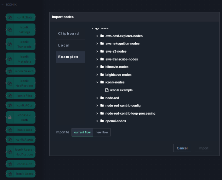 Drag the iconik API Auth node and any of the available iconik nodes from the left sidebar to your flow and connect them.