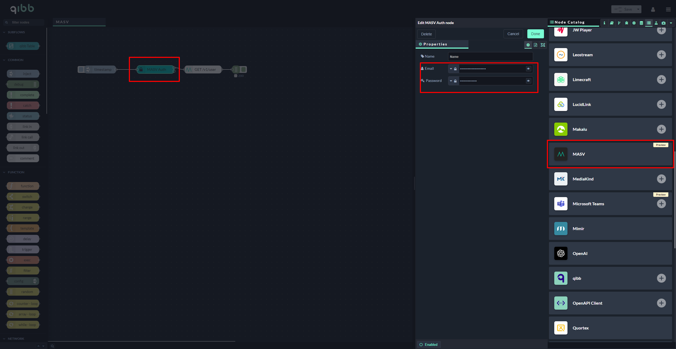Go to qibb Workflow Editor, open Node Catalog in the right sidebar, and install MASV node by clicking on the + button.