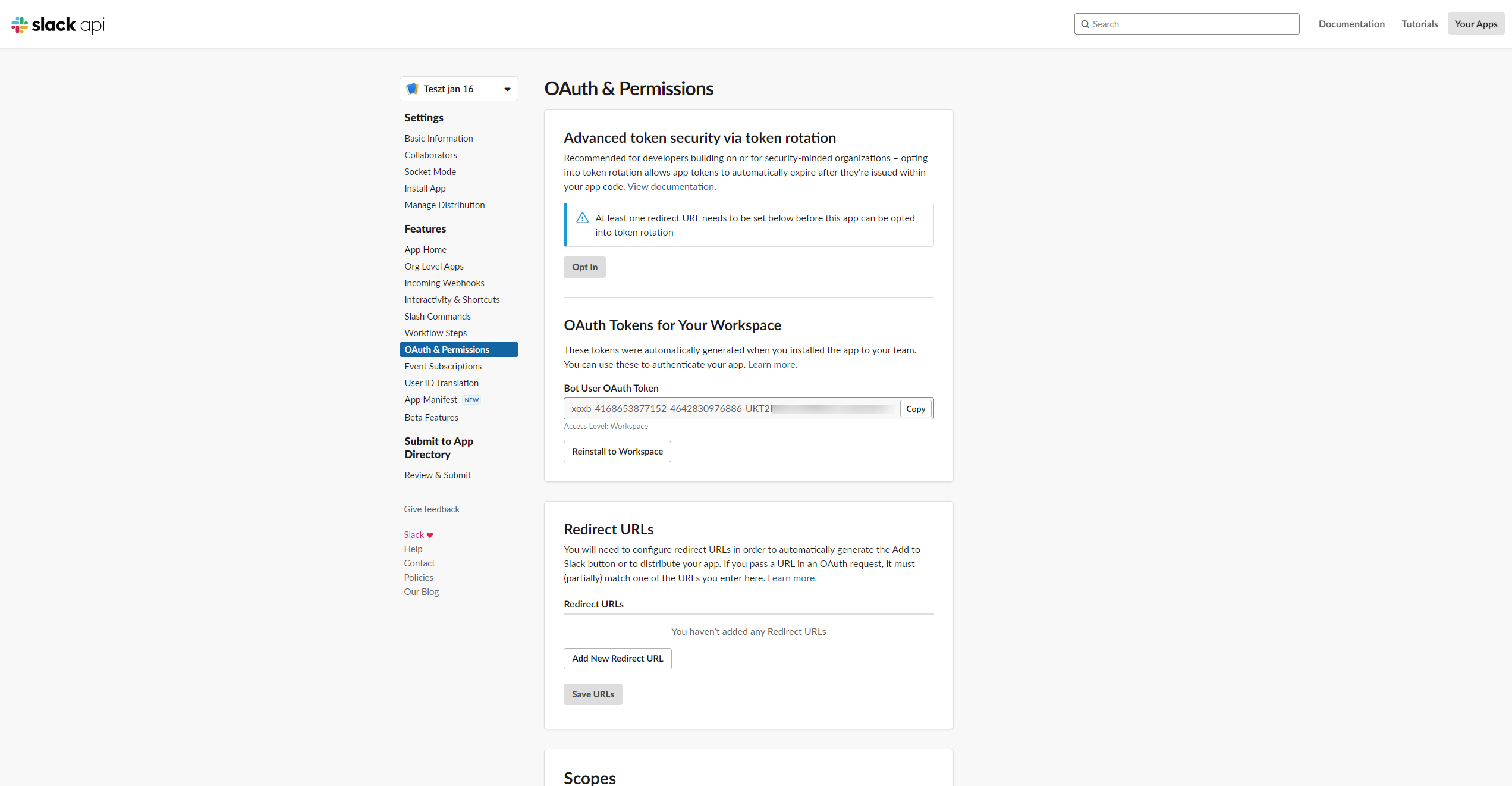 Visit Your Slack Apps page and select the Bot User you would like to use with qibb or set a new Bot by clicking on Create New App button. Navigate to Oauth & Permissions and Copy it. Bot token strings begin with
