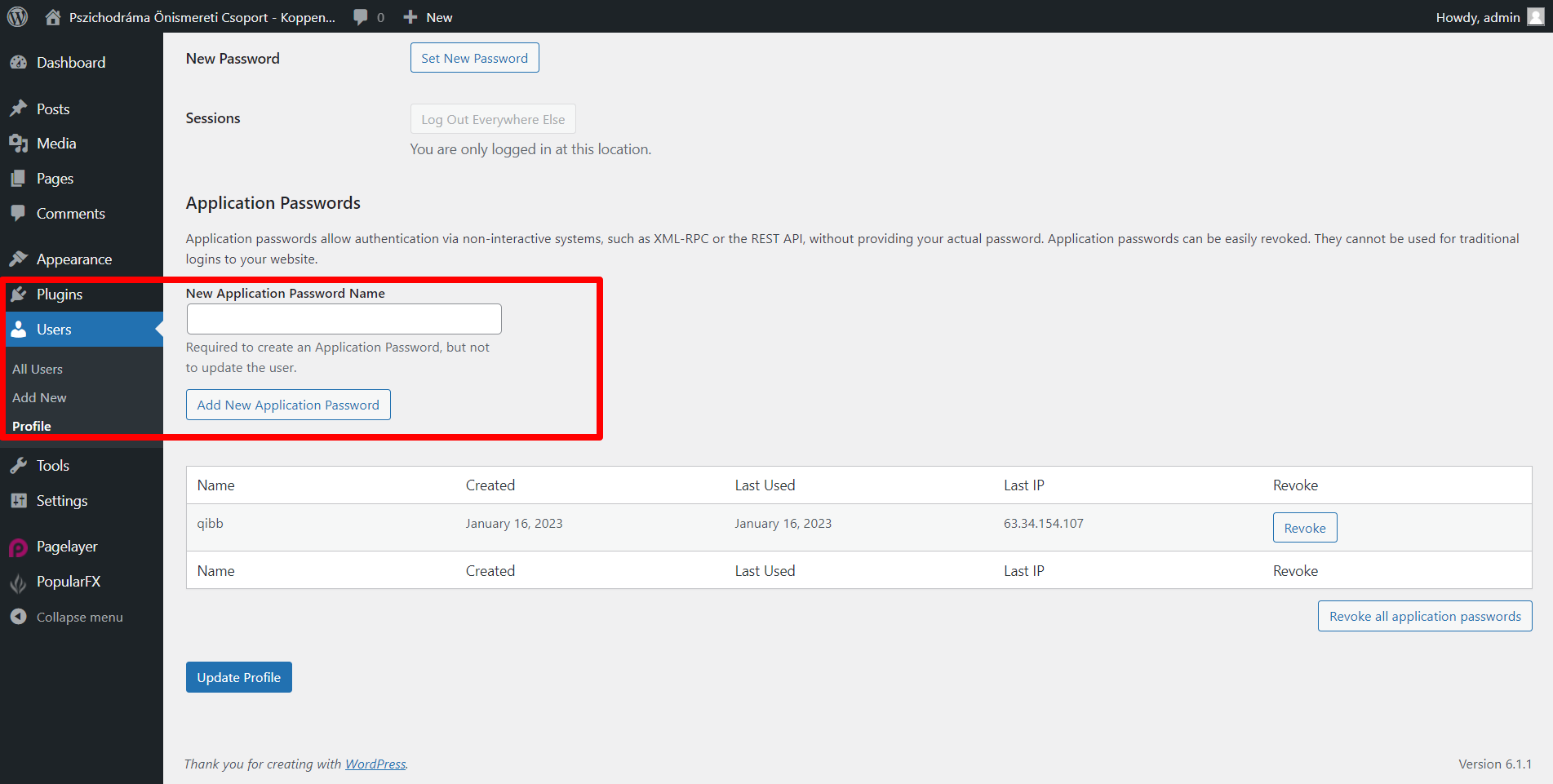 Log in to your WordPress application and select the Users menu on the left. Application passwords are recommended to allow authentication via non-interactive systems without providing your actual password. Application passwords can be easily revoked. Please create a new password by providing New Application Password Name and copy it.