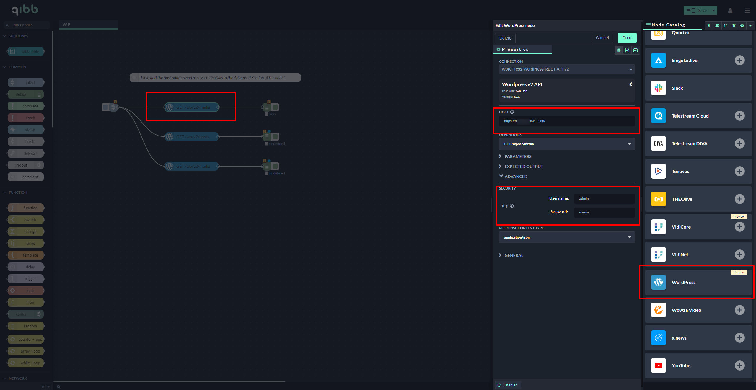 https://your-wordpress-server.com/wp-json/) into the Host field.Provide your Username and Password in the Advanced section and you can start using the node!