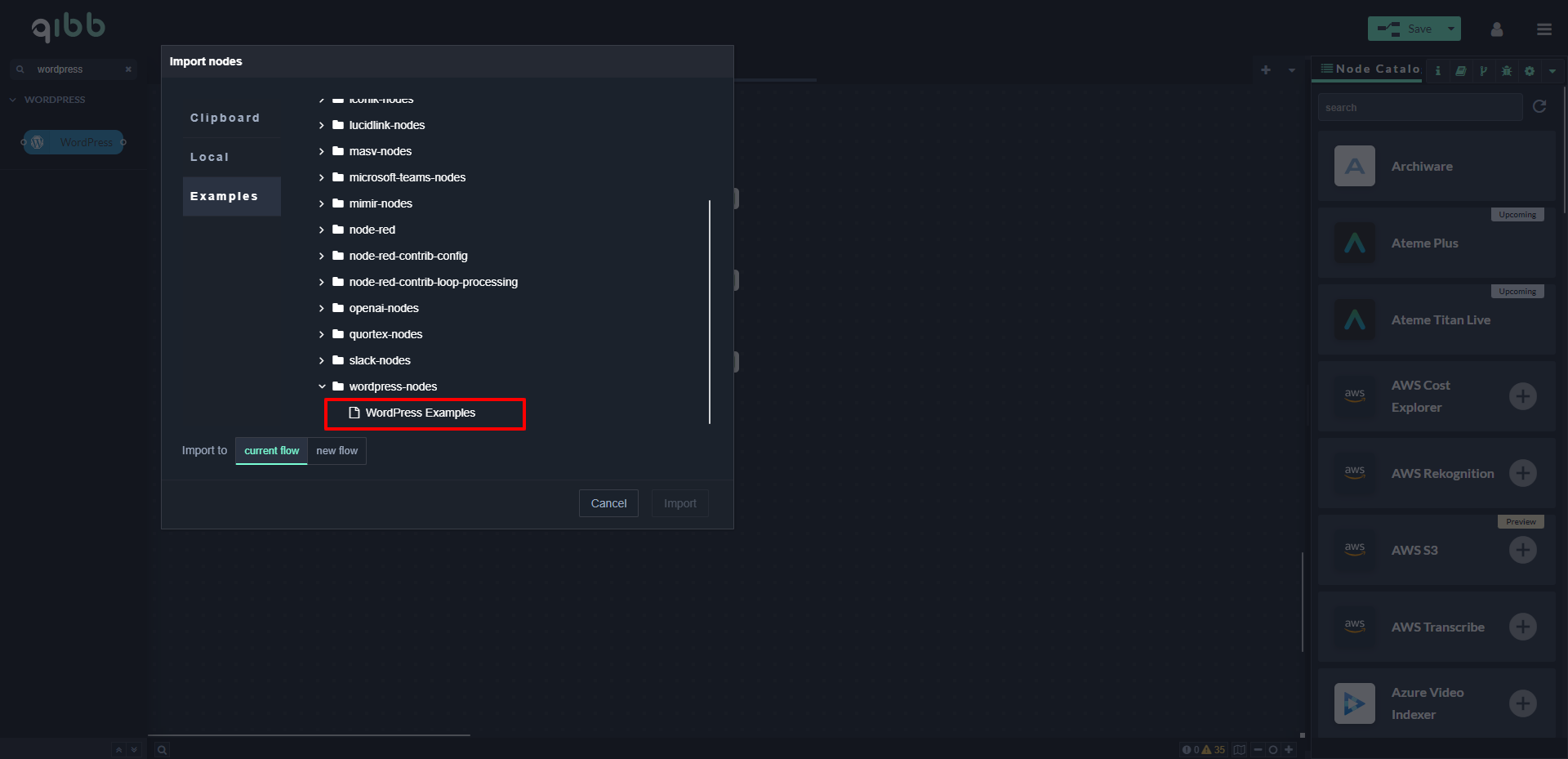 Go to qibb Workflow Editor, open Node Catalog in the right sidebar, and install WordPress node by clicking on the + button.