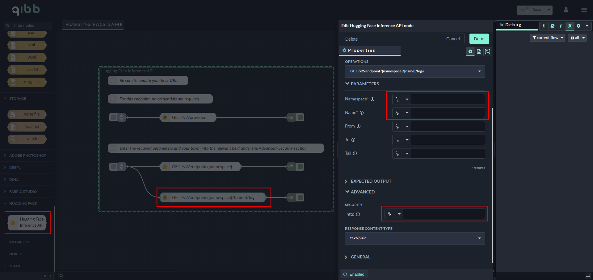 Open the Hugging Face node. Select an operation, enter your token and parameters as required, and you can start using the integration!