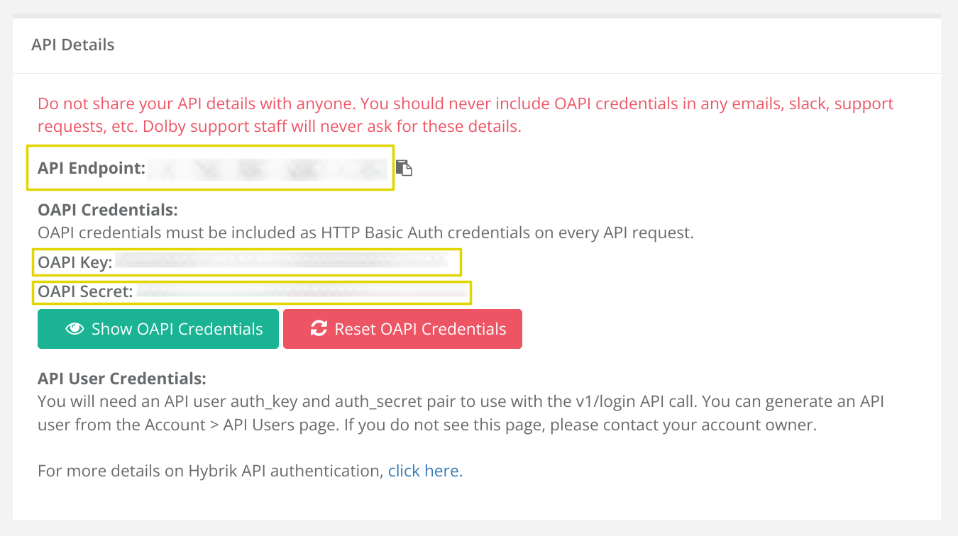 TheServer URL(API Endpoint base URL only) as well as theOAPI keyandsecretcan be found in the Hybrik Portal under Account > Info > API Details.
